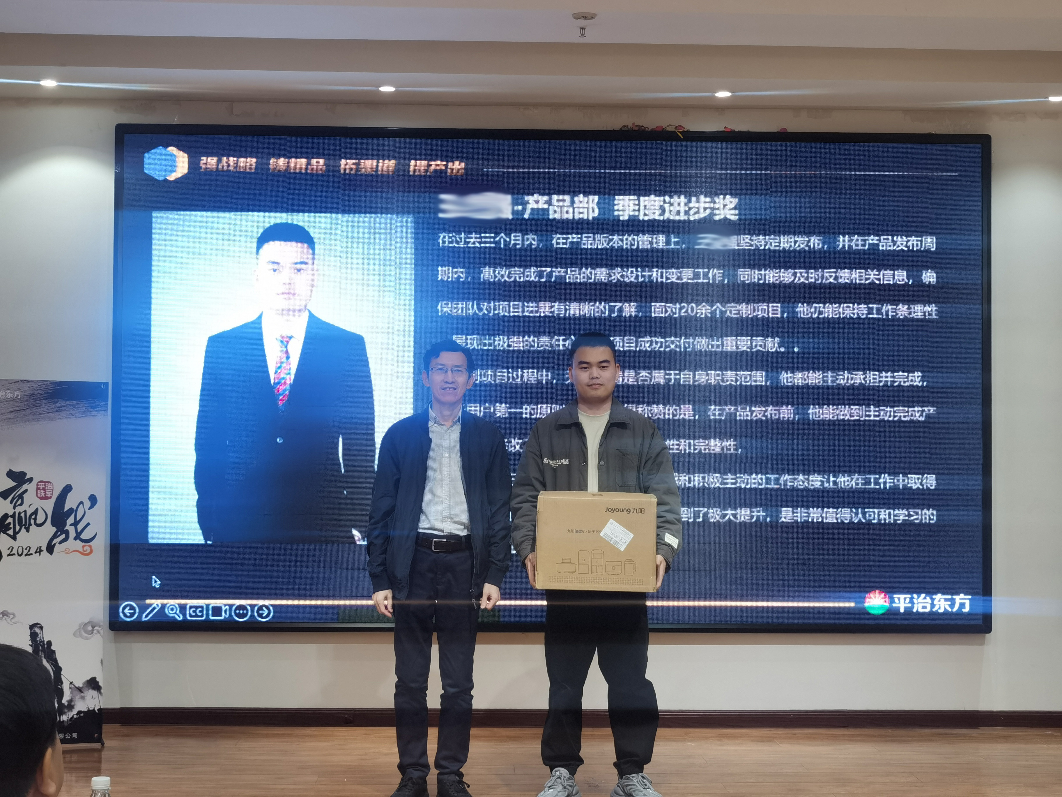 In 2024, the company launched the "Quarterly Sales Ranking" PK activity for all sales and channel teams. After fierce competition, three sales elites stood out and were awarded the title of "Quarterly Sales Star". Mr. Fan and Mr. Zhao personally presented them with prizes and bonuses to recognize their outstanding contributions.
